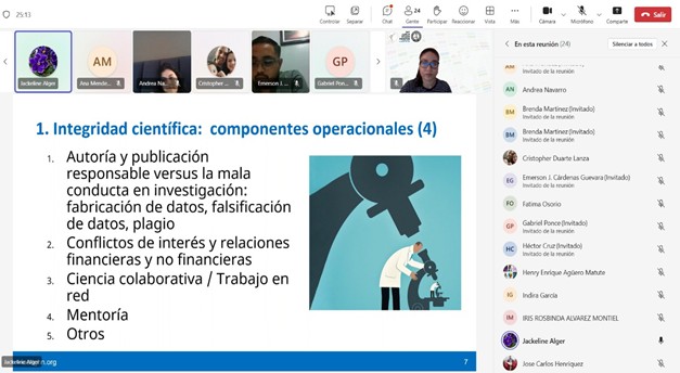 En la presentación se abordaron las definiciones y componentes de la integridad científica, el ecosistema de investigación incluyendo las partes interesadas con sus respectivas responsabilidades y cómo se puede contribuir a desarrollar un ecosistema que fomente la conducta responsable en investigación. Se presentó información del Hospital Escuela como un ejemplo de la manera de fomentar la conducta responsable en las investigaciones que se realizan en y con participación institucional. Se presentaron las diferentes experiencias para capacitar en metodología y ética de la investigación mediante la Clínica de Datos, los Club de Investigación, el Programa de Mentoría, los Talleres y Webinarios, entre otros, todos con recursos disponibles en la plataforma The Global Health Network Latinoamérica y el Caribe (TGHN LAC). Adicionalmente, se realizó una discusión alrededor de la autoría responsable revisando los criterios de autoría del Comité Internacional de Editores de Revistas Biomédicas.