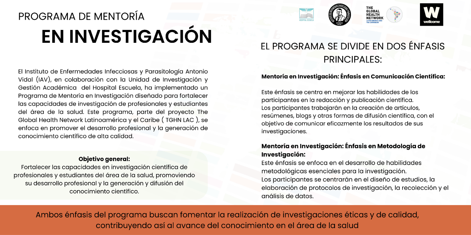 El Instituto de Enfermedades Infecciosas y Parasitología Antonio Vidal (IAV), en colaboración con el Departamento de Gestión Académica e Investigación, ha implementado un Programa de Mentoría en Investigación dirigido a los miembros del Club de Investigación en Enfermería del Hospital Escuela y del Centro de Capacitación e Investigación de Enfermería (CCIE). Este programa, como parte del proyecto The Global Health Network Latinoamérica y el Caribe ( TGHN LAC ), tiene como objetivo fortalecer las capacidades en investigación de las enfermeras, promoviendo su desarrollo profesional y contribuyendo a la generación de conocimiento en el área de la salud.