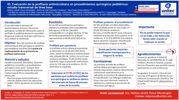 En el marco del Programa de Mentoría en Investigación del Hospital Escuela: Énfasis en Comunicación Científica del Hospital Escuela, y el Proyecto TGHN LAC Honduras, un grupo de profesionales ha consolidado avances significativos en la generación de evidencia aplicada en salud. Recientemente, los participantes presentaron resultados preliminares del estudio titulado “Evaluación de la profilaxis antimicrobiana en procedimientos quirúrgicos pediátricos: estudio transversal de línea base” en SLIPE 2025 – XXI Congreso Latinoamericano de Infectología Pediátrica, realizado en Chile. La presentación permitió compartir hallazgos iniciales sobre prácticas de profilaxis, brechas frente a protocolos institucionales y oportunidades de mejora en la calidad de la atención quirúrgica pediátrica, reflejando el impacto práctico de la investigación desarrollada bajo el programa de mentoría.