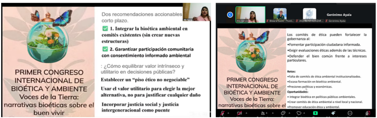 Participación de la Dra. Alis García (Honduras), compartiendo su perspectiva sobre el rol de los comités de ética y la consideración bioética hacia la naturaleza y la biodiversidad.