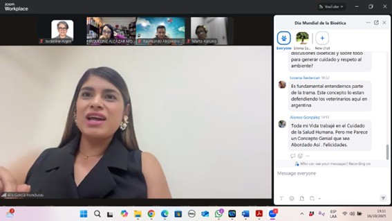 Conversatorio “Una sola Salud: perspectiva bioética”. Participación Dra. García, Hondura. Compartiendo su punto de vista en relación a la relevancia de la bioética en discusiones ambientales en Latinoamérica, plataforma Zoom, 16 de octubre de 2025.