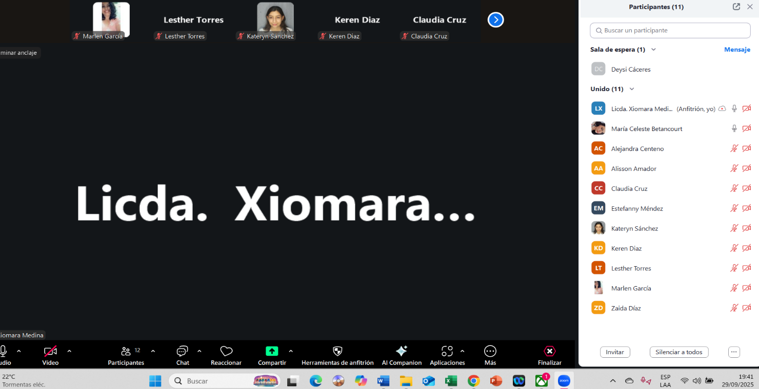 Reunión zoom realizada con estudiantes en servicio social de Licenciatura en Enfermería, Hospital Escuela, 29 de septiembre 2025.