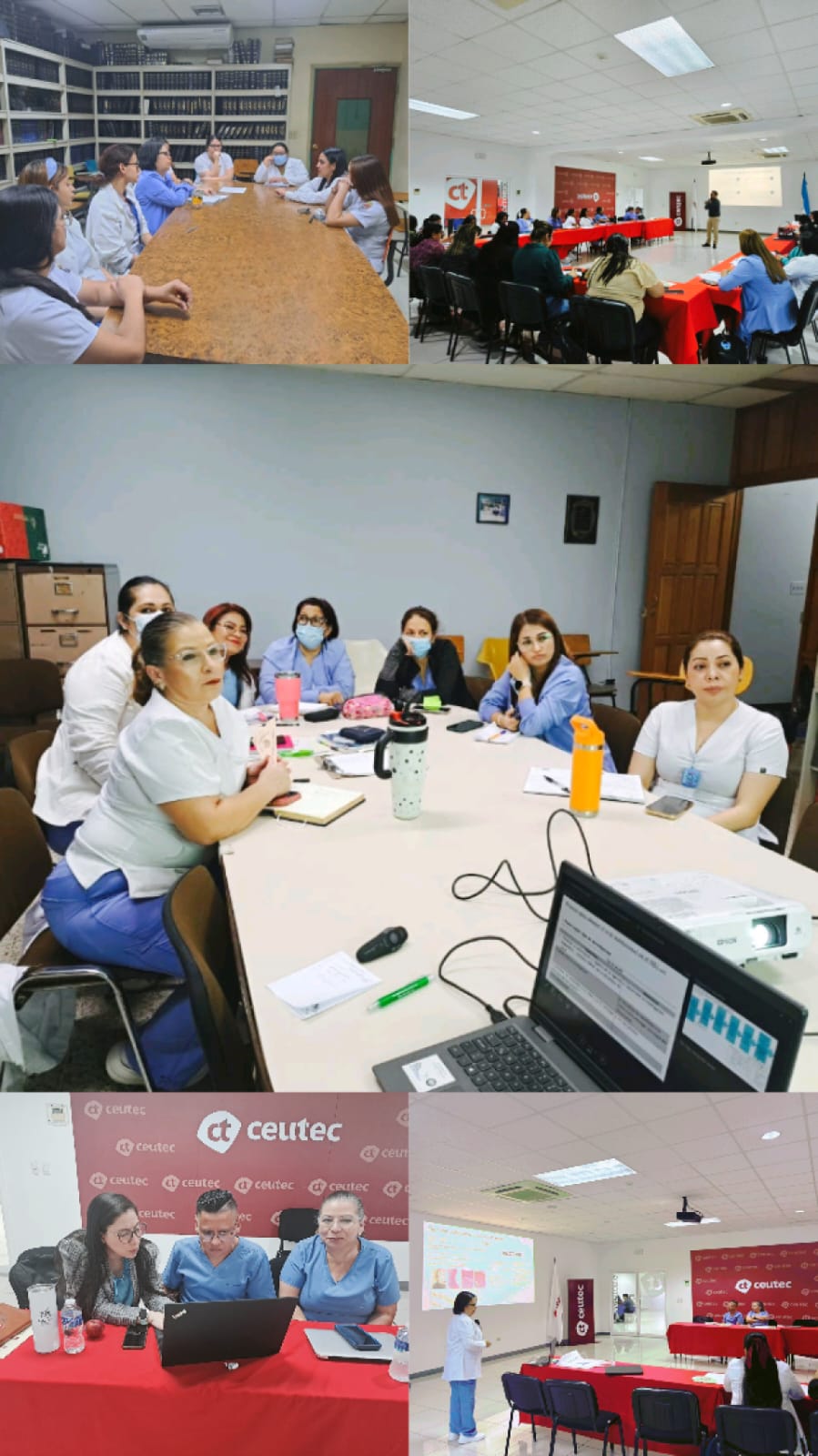 Figura 1 . Miembros del Club de Investigación en Enfermería del Hospital Escuela (HE) y del Club de Investigación en Enfermería del Centro de Capacitación e Investigación de Enfermería (CCIE), Tegucigalpa, Honduras, período 2024-2026. Se observa a los miembros durante las reuniones mensuales y en sesiones de capacitación específicas.