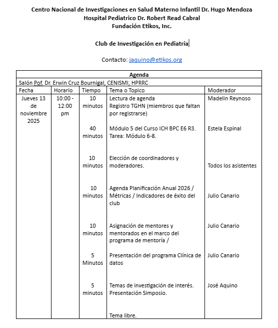 | Noviembre | 26/11/2025 | Sesión de discusión | Desarrollo del Curso: Buenas Prácticas en Investigación Clínica | Madelin Reynoso R. Estela Espinal |