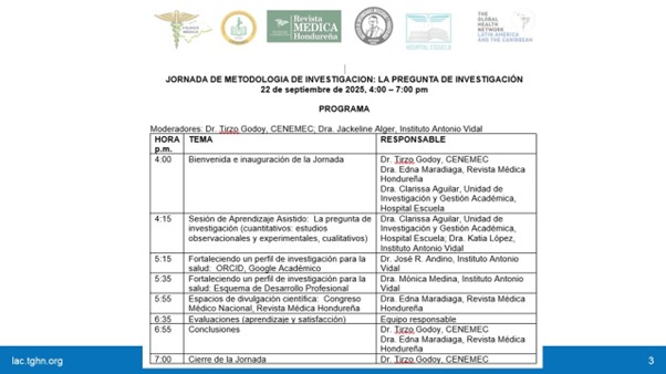 El 22 de septiembre de 2025 se llevó a cabo una Sesión de Aprendizaje Asistido, de tres horas de duración, en el marco de la Jornada de Metodología de Investigación: La pregunta de investigación, organizada en colaboración con el Colegio Médico de Honduras, la Revista Médica Hondureña, el Hospital Escuela, el Instituto de Enfermedades Infecciosas y Parasitología Antonio Vidal, y The Global Health Network Latinoamérica y el Caribe (TGHN LAC), en la plataforma Zoom del Colegio Médico de Honduras. Los participantes se inscribieron en la jornada después de haberse registrado en la plataforma TGHN LAC, completar el curso en línea La Pregunta de Investigación, compartiendo su certificado para completar su registro en la jornada (Ver noticia con la invitación).