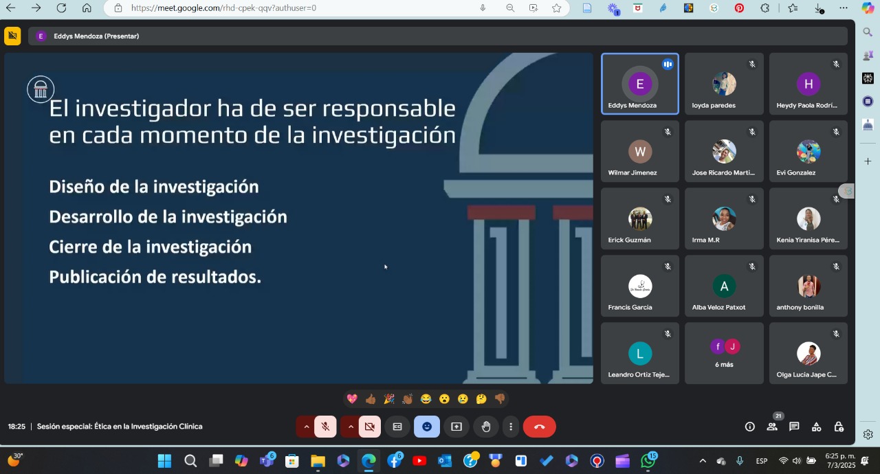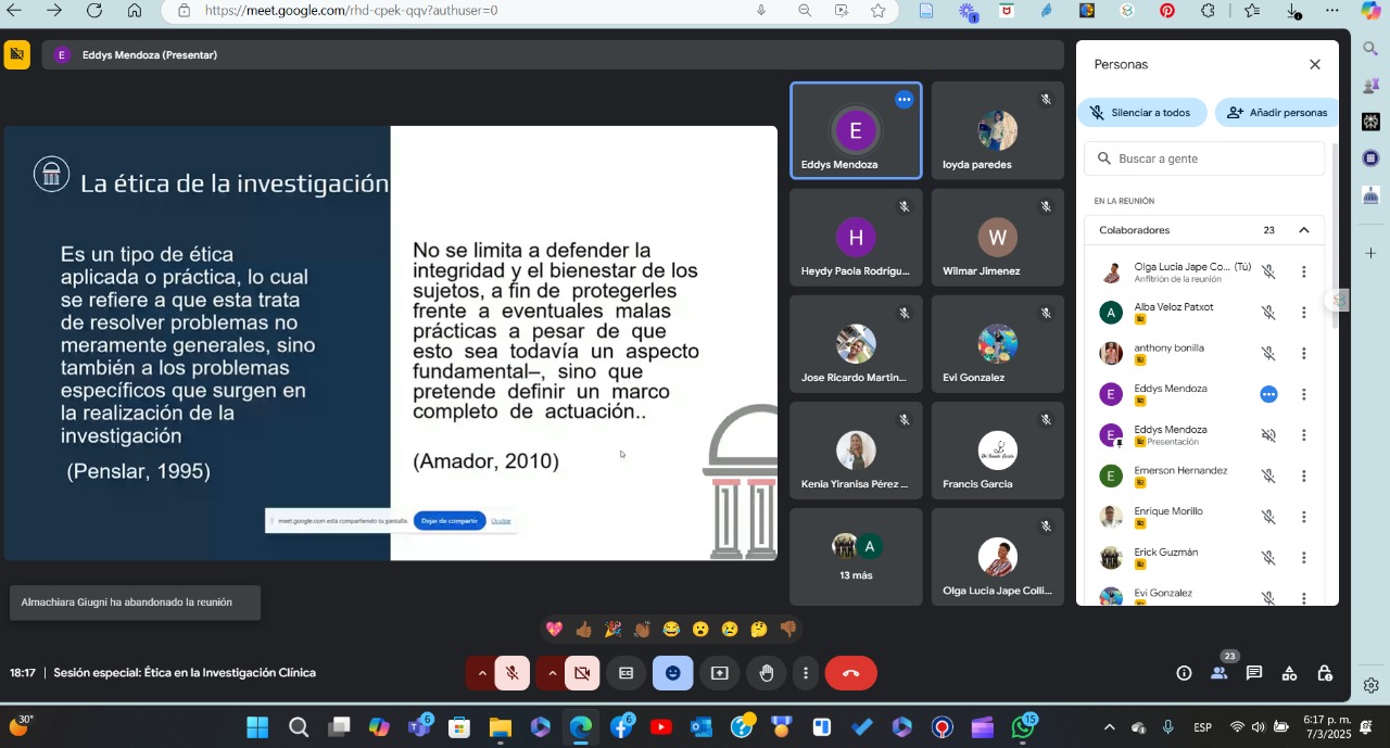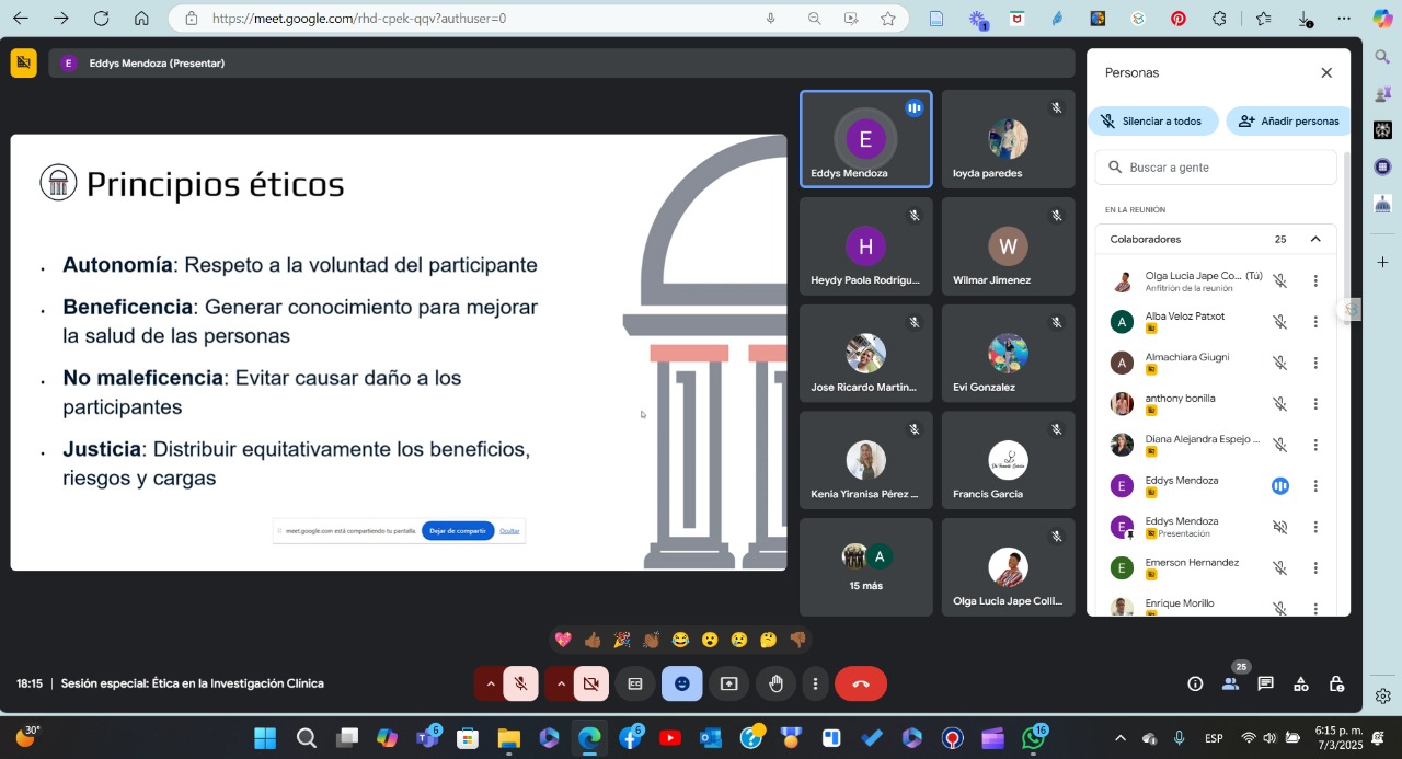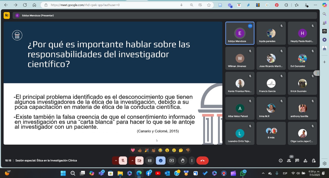 El rol de los comités de ética en la revisión y supervisión de protocolos de investigación. La actividad permitió a los participantes reflexionar sobre la necesidad de integrar la ética como un componente transversal en cada etapa de sus proyectos, asegurando investigaciones de calidad, con rigor metodológico y compromiso social.