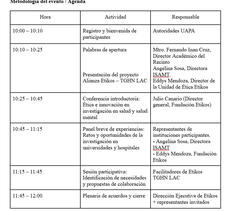 Luego de la apertura se procedió a una presentación de la Fundación Etikos como miembro de TGHN LAC, seguido de una conferencia sobre “Ética e innovación en la investigación en salud", panel de expertos y una sesión participativa con los asistentes.