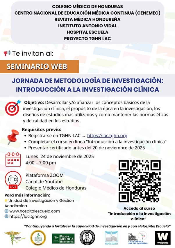 El próximo lunes 24 de noviembre de 2025, de 4:00 p.m. a 7:00 p.m., se llevará a cabo la Jornada de Metodología de Investigación: Introducción a la Investigación Clínica, un espacio formativo organizado por el Colegio Médico de Honduras, el Centro Nacional de Educación Médica Continua (CENEMEC), la Revista Médica Hondureña, el Instituto Antonio Vidal y el Hospital Escuela, en colaboración con el Proyecto The Global Health Network Latinoamérica y el Caribe (TGHN LAC) a través de la Unidad de Investigación y Gestión Académica del Hospital Escuela.