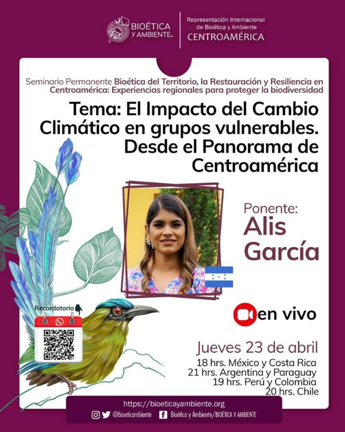 Seminario 23 de abril de 2026: El impacto del Cambio Climático en grupos vulnerables. Desde el Panorama de Centroamérica. Dra. Alis García, Tegucigalpa, Honduras.