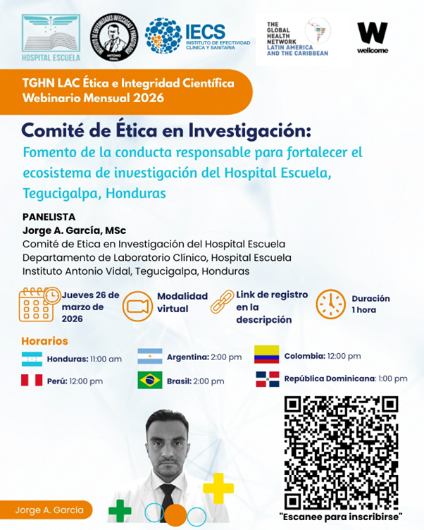 El próximo 26 de marzo de 2026 se llevará a cabo el seminario web “Comité de Ética en Investigación: fomento de la conducta responsable para fortalecer el ecosistema de investigación del Hospital Escuela, Tegucigalpa, Honduras”.