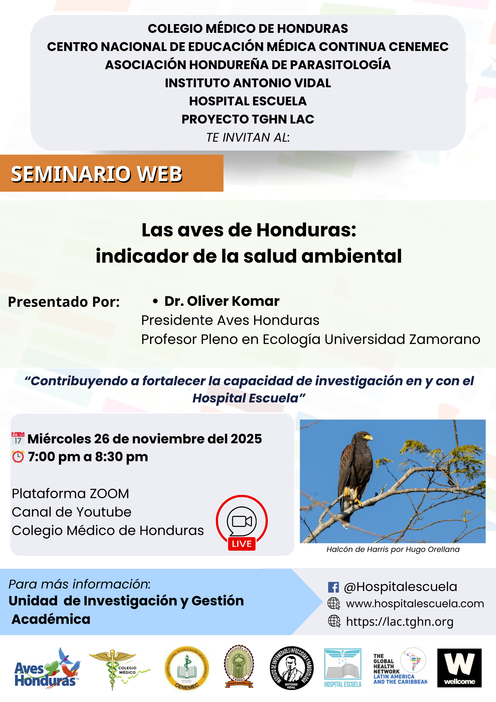 El Proyecto TGHN LAC, en colaboración con el Colegio Médico de Honduras, el Centro Nacional de Educación Médica Continua (CENEMEC), la Asociación Hondureña de Parasitología, el Instituto Antonio Vidal , el Hospital Escuela y Aves Honduras, llevará a cabo el seminario web “Las aves de Honduras: indicador de la salud ambiental”, una actividad orientada a fortalecer las capacidades de investigación y formación científica en temas de salud pública y medio ambiente.
