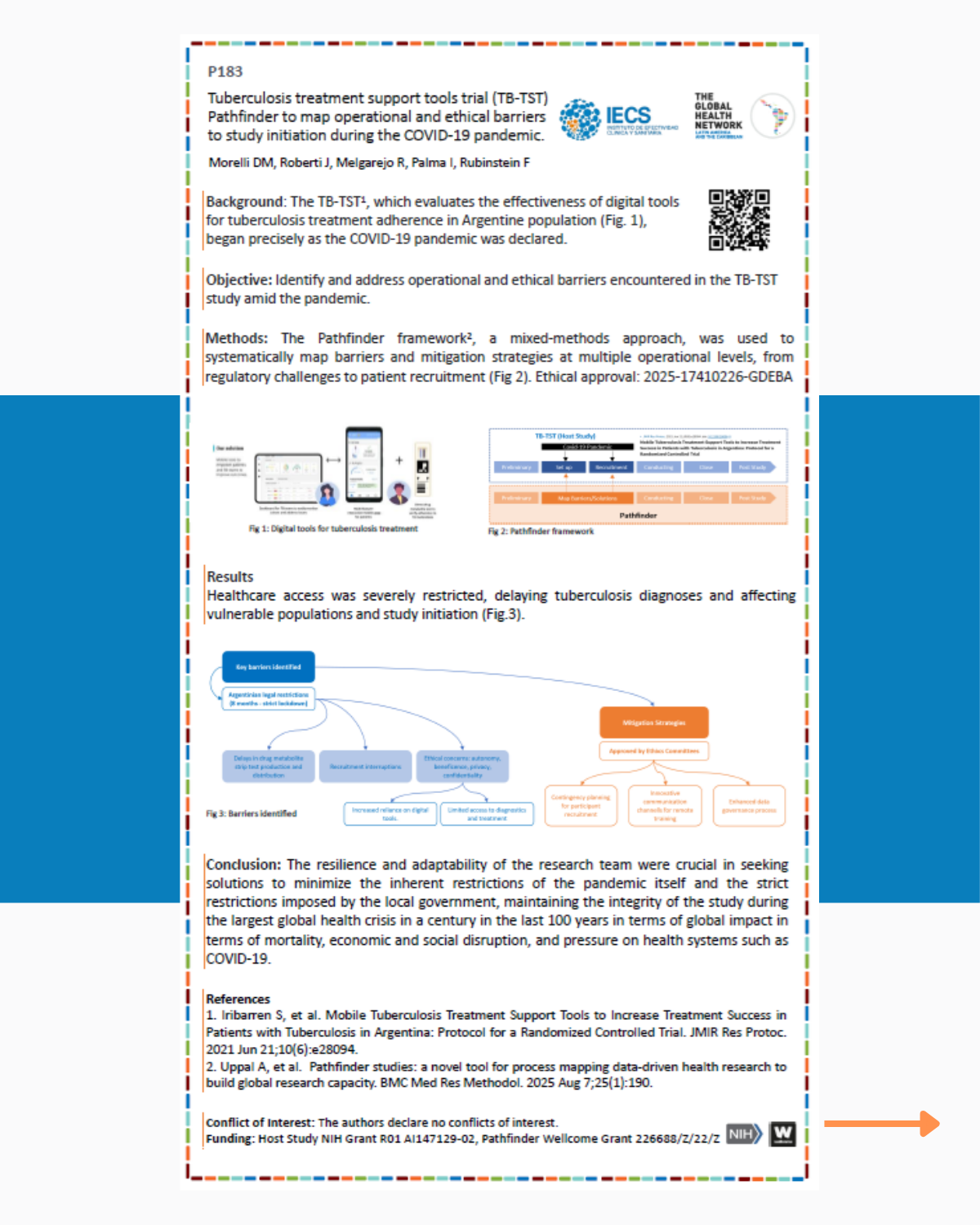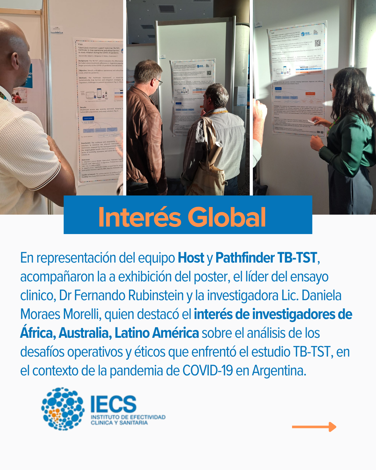 Representing both the Host and Pathfinder TB-TST teams, Dr Fernando Rubinstein, principal investigator of the clinical trial, and Lic. Daniela Moraes Morelli attended the poster exhibition. Morelli highlighted the strong interest from researchers across Africa, Australia, and Latin America in the analysis of operational and ethical challenges faced by the TB-TST study during the COVID-19 pandemic in Argentina.
