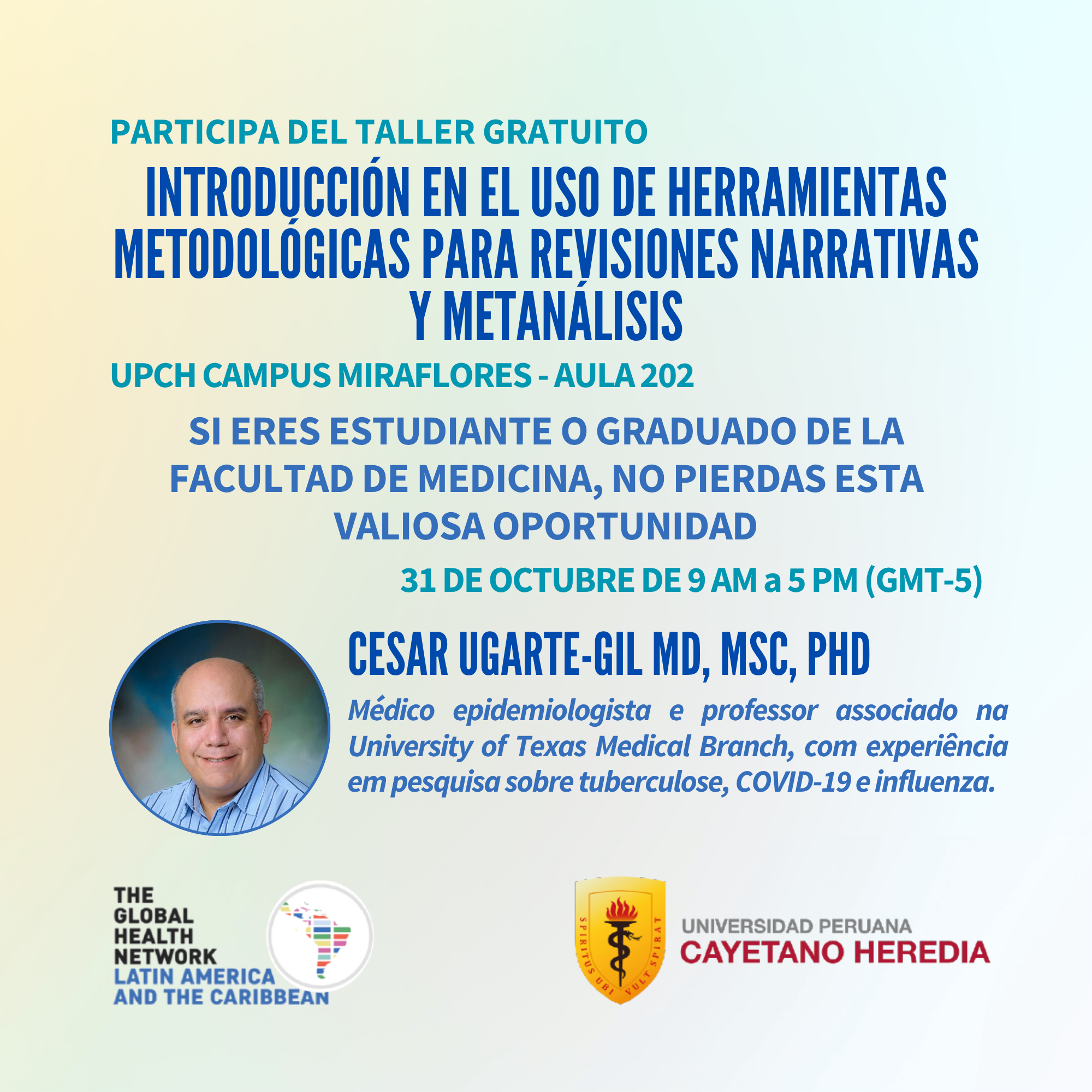 👨🏫Facilitador: Dr. César Ugarte-Gil, médico epidemiólogo y profesor asociado en la University of Texas Medical Branch, con experiencia en investigación de tuberculosis, COVID-19 e influenza.