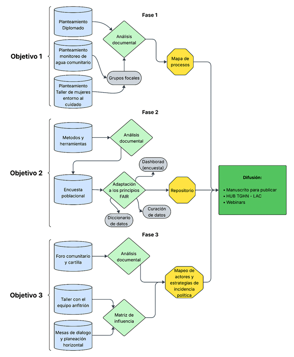 Como uno de los resultados centrales del Objetivo 1, se construyó un mapa de procesos interactivo. Para su elaboración, se identificaron y seleccionaron tres estrategias de participación comunitaria que desarrolló el proyecto anfitrión (Diplomado, Taller de mujeres entorno al cuidado, monitoreo de agua comunitario). La caracterización de las estrategias se realizó en cuatro ejes temáticos pertinentes desde la metodología pathfinder (Planeación, Desarrollo, Resultados y Lecciones Aprendidas).